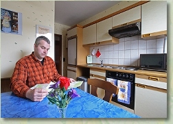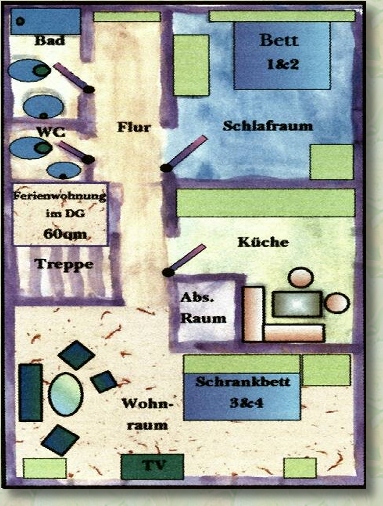 hellgeschnittene Wohnung im Dachgeschoss 60qm und Gartenbereich. Im großzügigen Wohnzimmer mit Stereoanlage und TV ist ein weiteres Schrankbett und Einzelbett. Das Schlafzimmer ist mit einem bequemen Doppelbett ausgestattet, Bettwäsche und Handtücher sind enthalten. Die gemütliche Küche ist mit Herd, Ofen und Kühlschrank ausgestattet, Wasserkocher, Mikrowelle, Kaffeemaschine und Geschirr für vier Personen sind vorhanden. Pkw Parkplatz auf dem Grundstück |